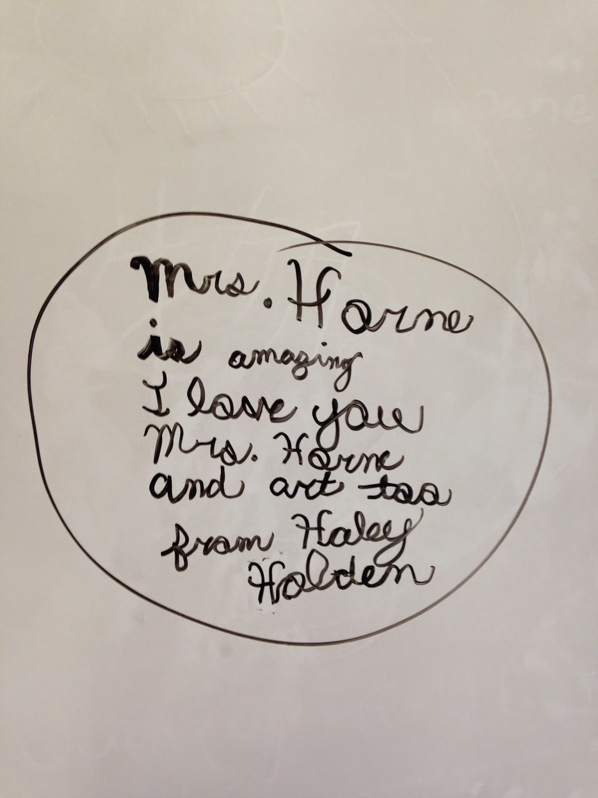 Hey there! Well, those of you that have been following my blog for awhile know that 4 years ago I stepped into the roll of part-time art teacher here at Arbor Springs Elementary School. It's a non-certified part-time art teaching position. I teach 1st-5th grade Monday-Friday from 7:45-1:45. It's a sweet deal. It has however, it's been a roller coaster of an experience. I am not going to lie. Some-days I literally want to scream. Other days I can't catch a breath. And then someone places an "I love you Mrs. Horne" note on my desk and I cry. It has been a great place for me to come to my senses about what I want to do when I grow up. Since being here I've updated my art teaching certification and added Family and Consumer Science. I have the best friends here....in-particular the front office staff Beverly, Donna, Julie and Rebecca. Good grief when I told them we were all crying and hugging and smiling for joy together. You know you've got it good when you are treated like I was in that moment.